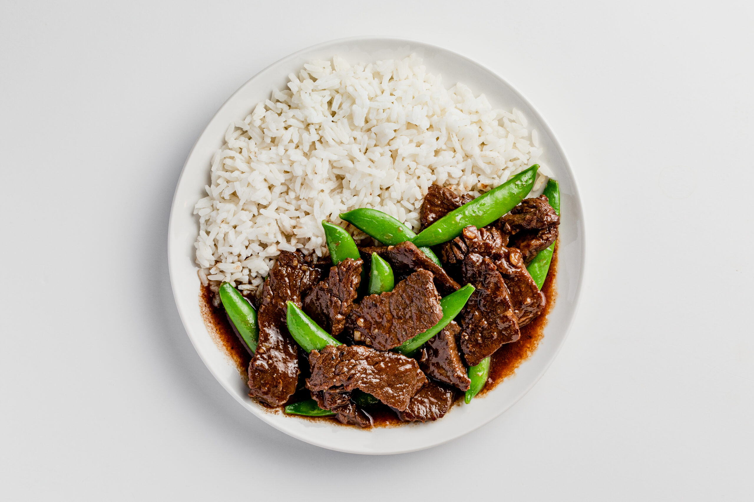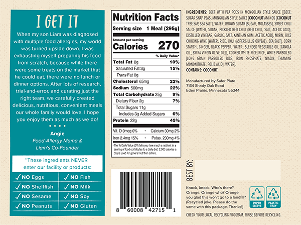 Cooked beef in Mongolian-style sauce with pea pods and rice. Free of the top allergens but full of flavor!