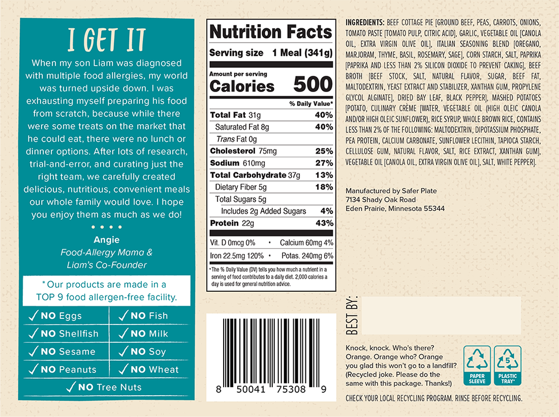 A hearty combo of beef, peas, and carrots topped with mashed potatoes. Free of the top allergens but full of flavor!
